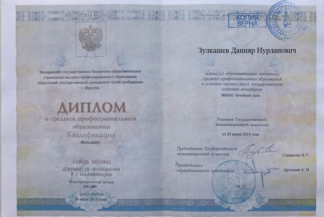 Меня зовут Зулкашев Данияр Нурланович, я — фельдшер выездной наркологической бригады в наркологической клинике "Плюс" в Новотроицке. Я стремлюсь помогать людям, оказывая квалифицированную медицинскую помощь в самых разных ситуациях, и верю, что каждый пациент заслуживает внимания и поддержки на пути к выздоровлению.